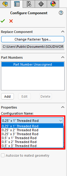 TIP: If using configurations, name them in a clear, structured way (e.g., “M8x25”, “0.25"-20x1.00”).