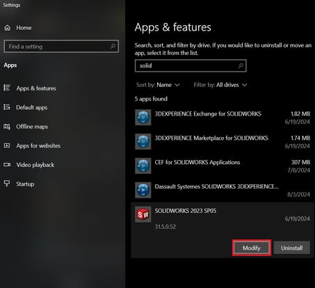 Find the LATEST INSTALLED VERSION OF SOLIDWORKS Standalone in the list and select Modify. For instance, if you have SOLIDWORKS 2023 and 2026 installed, modify the 2026 installation.