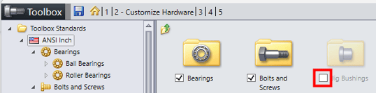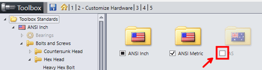 To disable a specific category within a standard (e.g., Washers or Pins), click on the standard to navigate to the categories within and unselect the checkbox for any you would like to remove from view in SOLIDWORKS and Save.