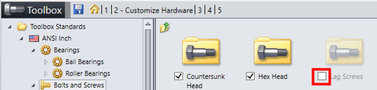 - To disable a specific component family within a category (e.g., Countersunk Head or Lag Screws), click on the category and unselect the checkbox for any you would like to remove from view in SOLIDWORKS and Save.