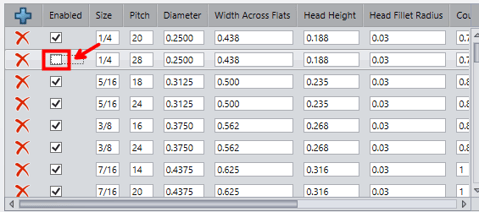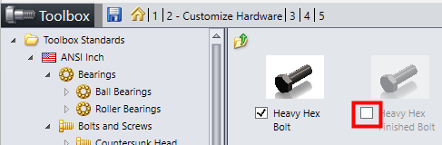 - To disable a specific component type within a family (e.g., Heavy Hex Bolt or Heavy Hex Finished Bolt), click on the component family and unselect the checkbox for any you would like to remove from view in SOLIDWORKS and Save.