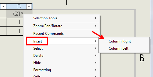 Right-click on a column in the BOM and select Insert > Column Right/Left to add new columns.