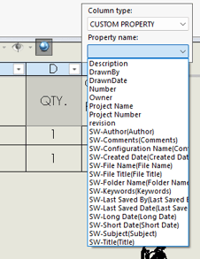Choose a property (e.g., Description, Material, Weight, Vendor) from the Property name dropdown. This will pull from the assembly/part file's custom/configuration specific file properties.