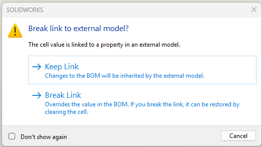 TIP: If you double-click on a cell that is tied to a part/assembly custom/configuration specific file property, you should be prompted to either keep or break the link. If you select Keep Link, editing the property in the drawing will push the change to the part/assembly file, providing a quick and efficient method to edit properties en masse.