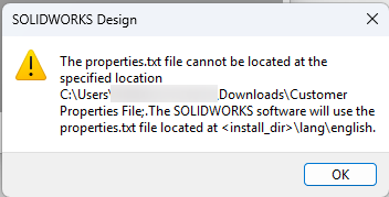 Learn how to resolve the SOLIDWORKS warning that appears when the software cannot locate the required properties.txt file.