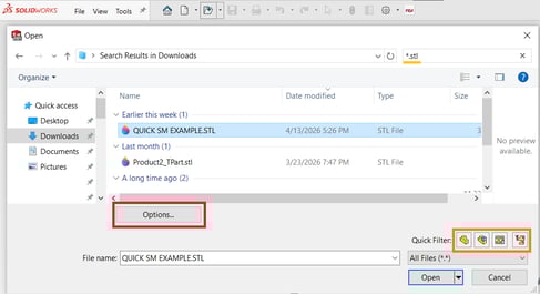 - If you do not see any .stl files, but expect they should be there, check to make sure that your SOLIDWORKS Quick-filter options are disabled