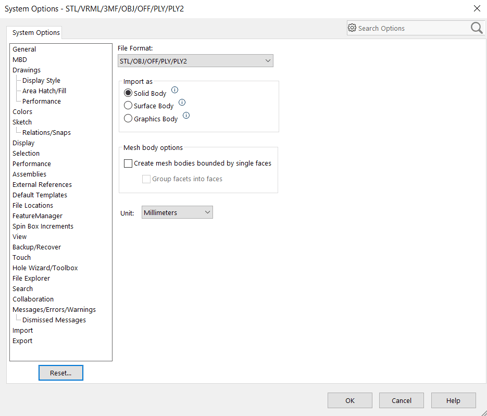 Tip: While this article references .stl files, SOLIDWORKS can use a similar methodology to open .obj, .off, and .ply files too!