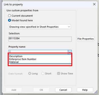 TIP: If you do not see any properties in the Property name dropdown, confirm that the properties are already populated in the drawing file or the part/assembly referenced on the drawing sheet.
