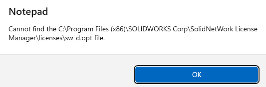 How to Resolve 'Cannot find the C:\Program Files (x86)\SOLIDWORKS Corp\SolidNetWork License Manager\licenses\sw_d.opt file'