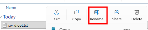 5. Right-click on the sw_d.opt text file, and select Rename.