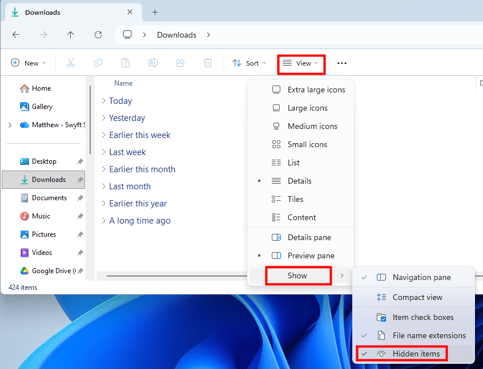 4. Select the View dropdown, and turn on Hidden items in the Show fly out.