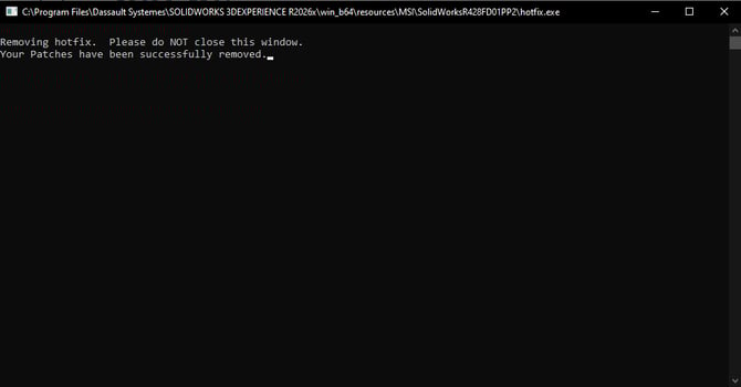 - "C:\Program Files\Dassault Systemes\SOLIDWORKS 3DEXPERIENCE R2026x\win_b64\resources\MSI\SolidWorksR428FD01PP2\hotfix.exe" /reinstall /s /k