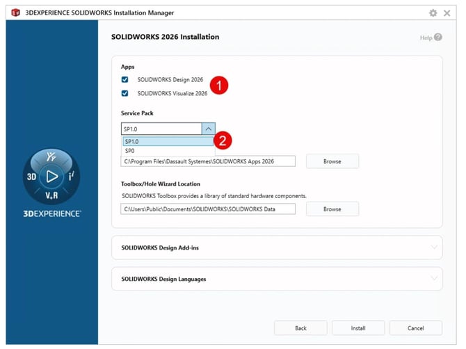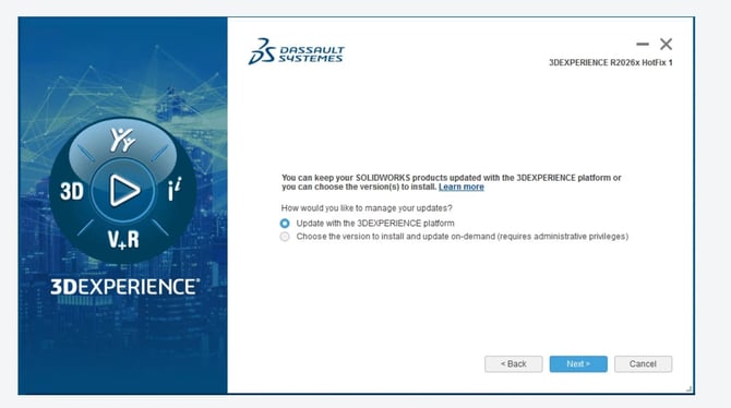 Starting with 3DEXPERIENCE platform 2026x FD01, you will see a new prompt asking how to manage updates on any new installation of SOLIDWORKS Design and Visualize.