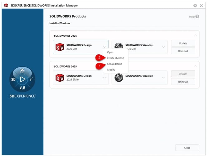 If you install multiple versions of SOLIDWORKS Apps, launch the 3DEXPERIENCE SOLIDWORKS Installation Manager to declare which version will launch by default from the Platform (1). For more control, create a version-specific shortcut (2).