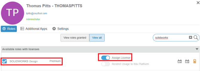 Select the user associated with a changed role (such as switching from SOLIDWORKS Design Premium to Standard